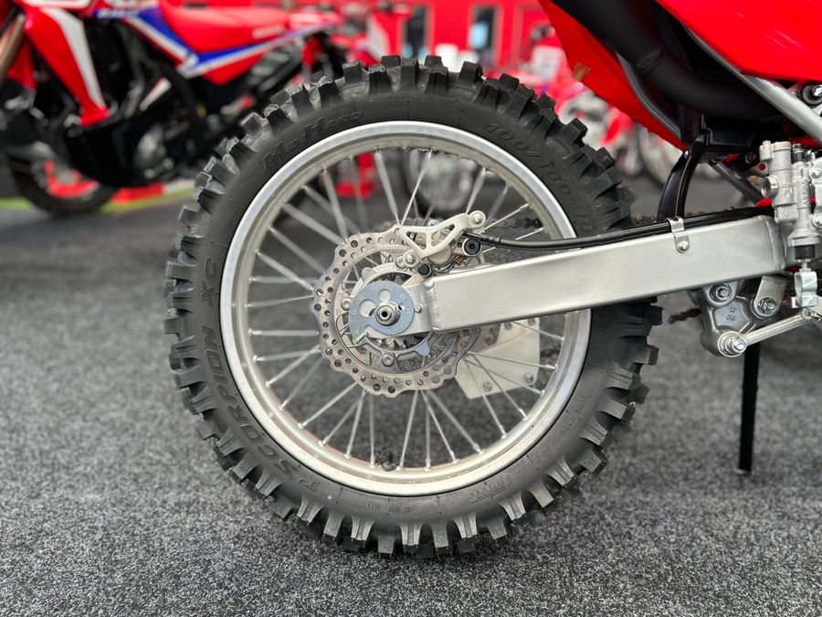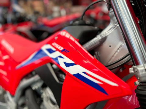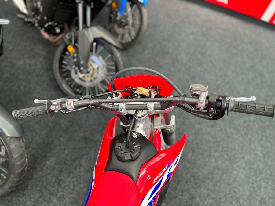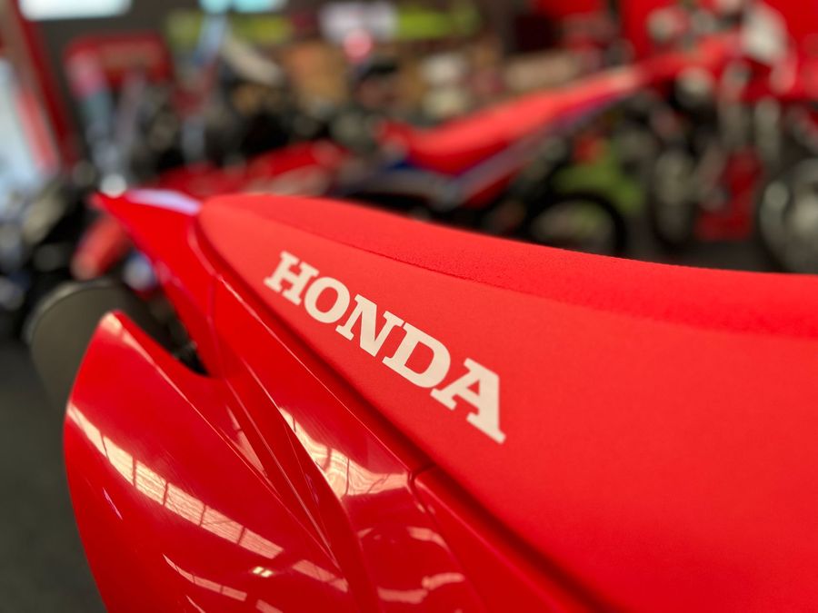 User friendly 250cc air-cooled single-cylinder 4-stroke with handlebar-mounted low-fuel and “key on” indicator lights. Lightweight at only 114kg kerb weight with a smooth ride thanks to Pro-Link Showa single shock with spring pre-load adjustability, finished with championship style from CRF MX-inspired muffler with compact positioning and CRF MX-inspired bodywork and graphics.