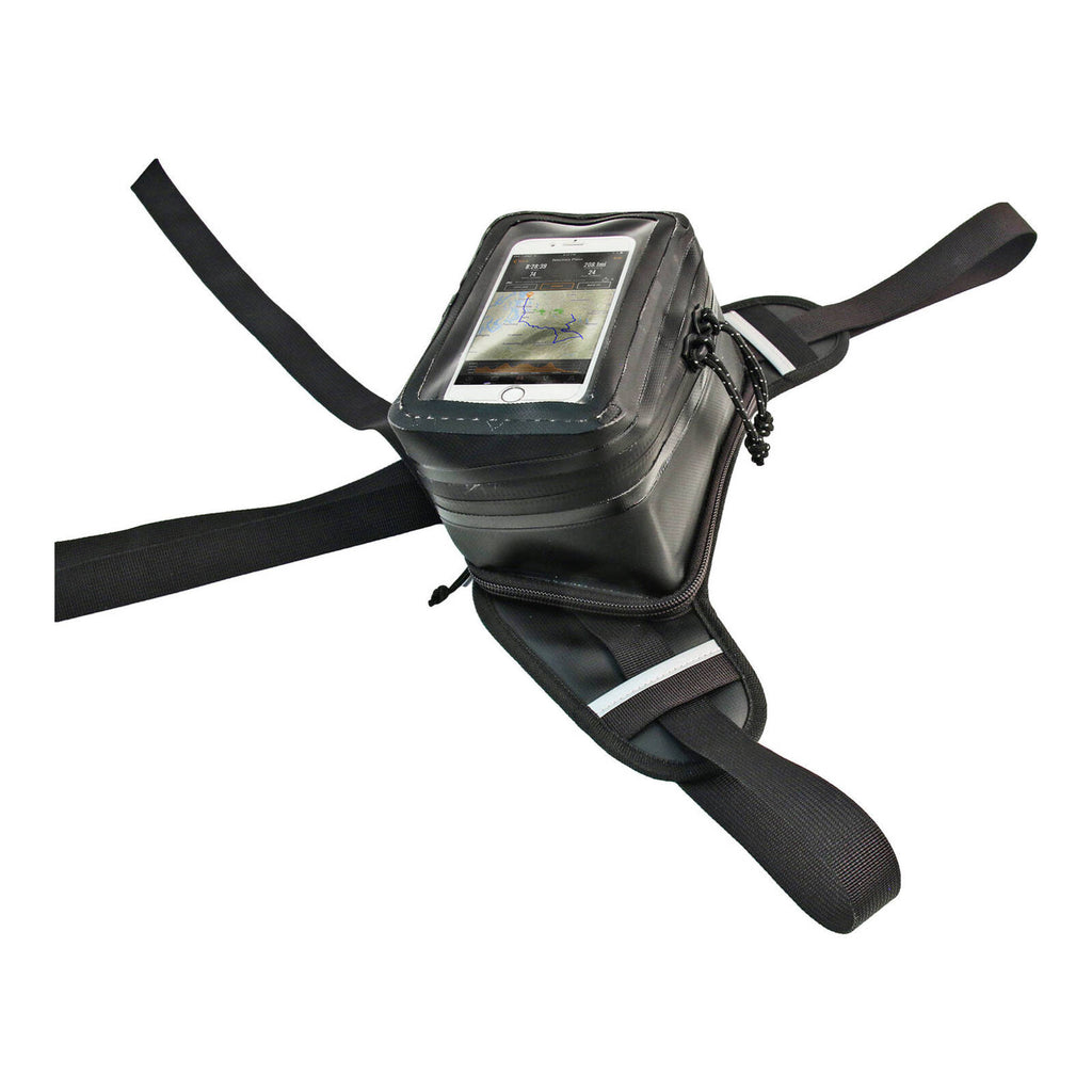 Other key features include rugged Bomb Shell™ coated fabric construction with RF-welded seams, a key clip, internal elastic to keep items organized and secure, a clear vinyl smartphone/map pocket, and an electronics pass-through for on-bike charging and power access (we recommend the BikeMaster USB charger). The clear smartphone/map lid pocket also allows glances at maps or notifications. Combine the Buckin' Roll with Giant Loop Pannier Pockets and Zigzag Handlebar Bag for even more on-the-trail storage volume.