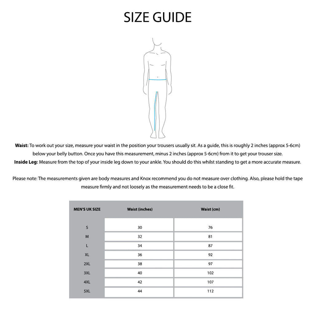 - CE Approved Knox Micro-Lock Compact Knee (L2) and Hip (L1) Protectors are fitted as standard in soft cotton pockets, easily removable for washing